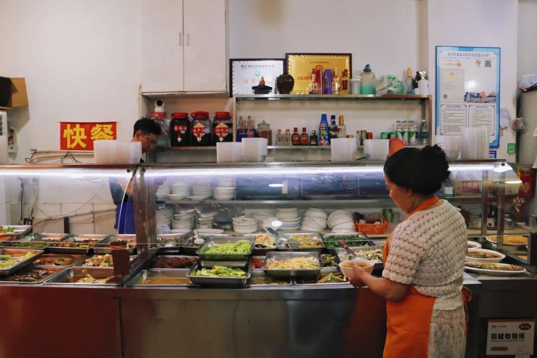 温州饭摊和左边的温州人家,两家店挨在一起,外观除了遮阳棚一个是粗条纹一个是细条纹,再无不同。我们猜测其可能是兄弟饭馆。饭点时分抵达,选了张桌子坐下,询问老板才发现并没有菜单。“快餐”两个字贴在门口柱子上,旁边则摆满了一长排已经制作好的菜品,一眼扫过,大概有近50种。
