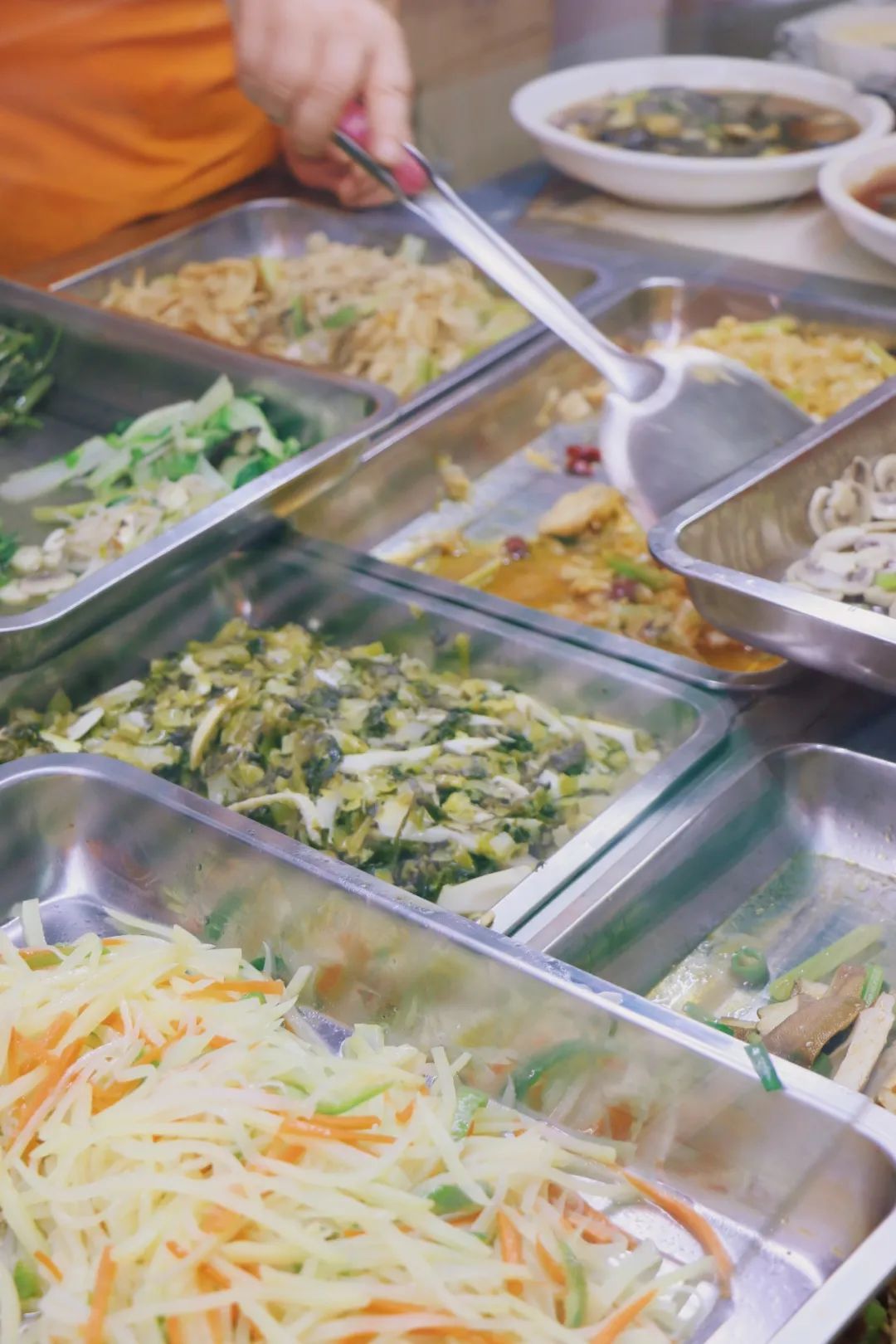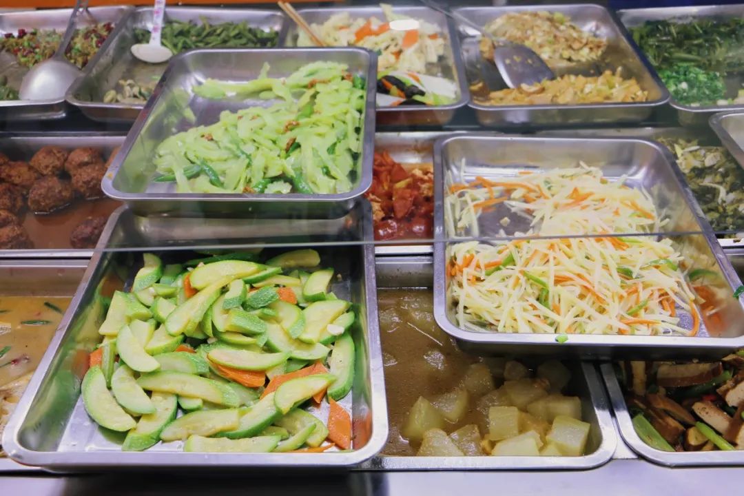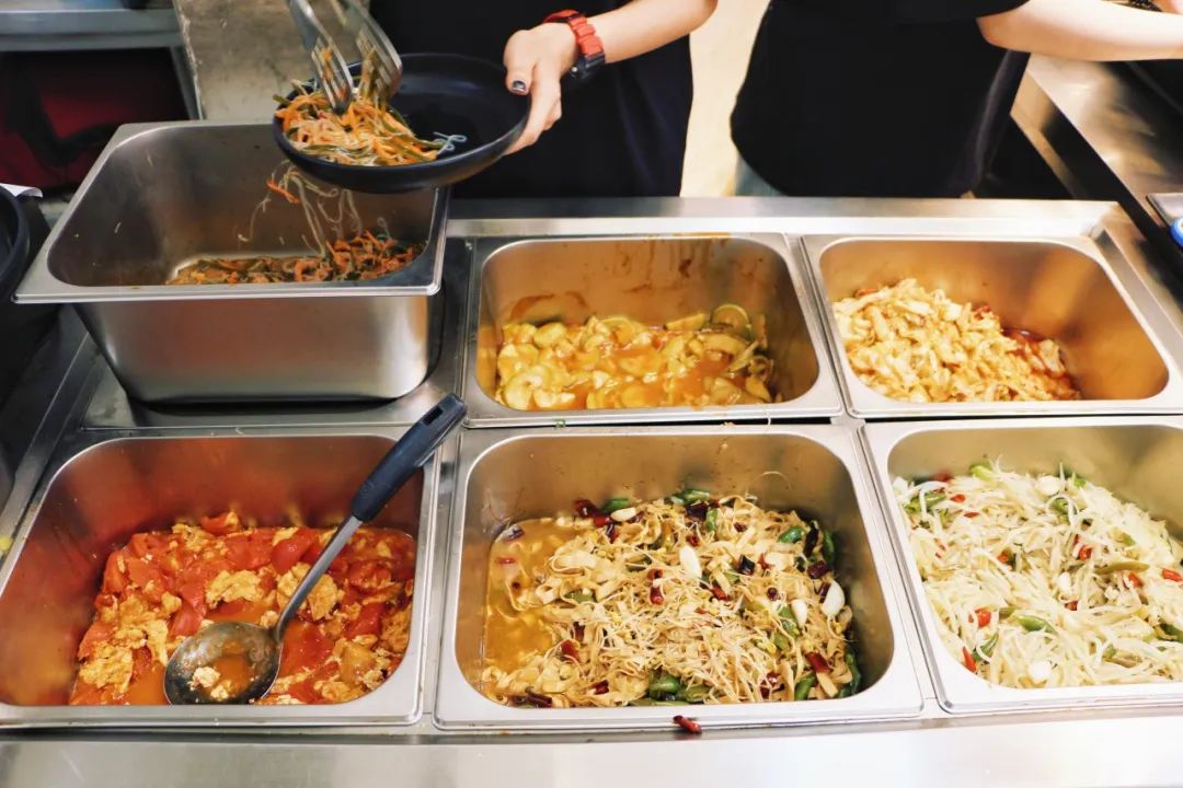 老板身后放置着微波炉,荤菜类会加热后再上桌,素菜等则可以直接上桌,主打一个边看边点边端,迅速开吃。