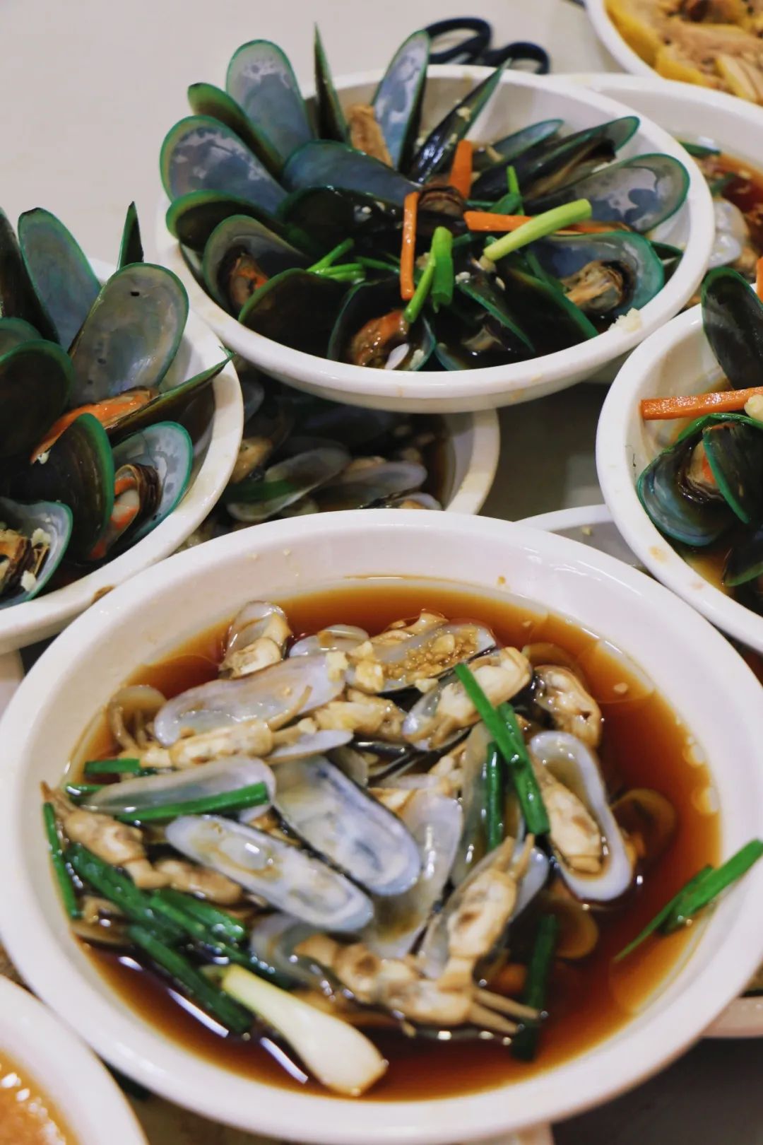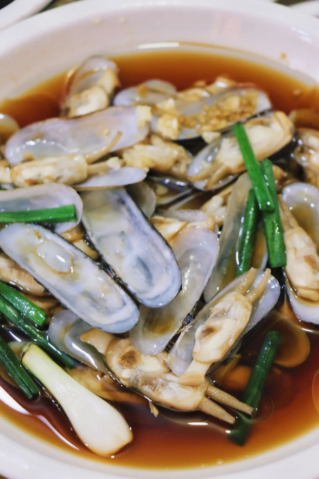 这家店的特色,便是有许多海鲜。蛏子、鱿鱼、带鱼、虾蟹等,“新鲜、清淡”是回头客们常念叨的评价;素菜则是各种时令蔬菜等,可以拼盘。曾经在海边吃过辣炒蛏子,很是下酒。清蒸蛏子倒是在这家第一次吃上。他家的蛏子处理得很干净,个头也大,沾点酱油更显得鲜美,很是好评。