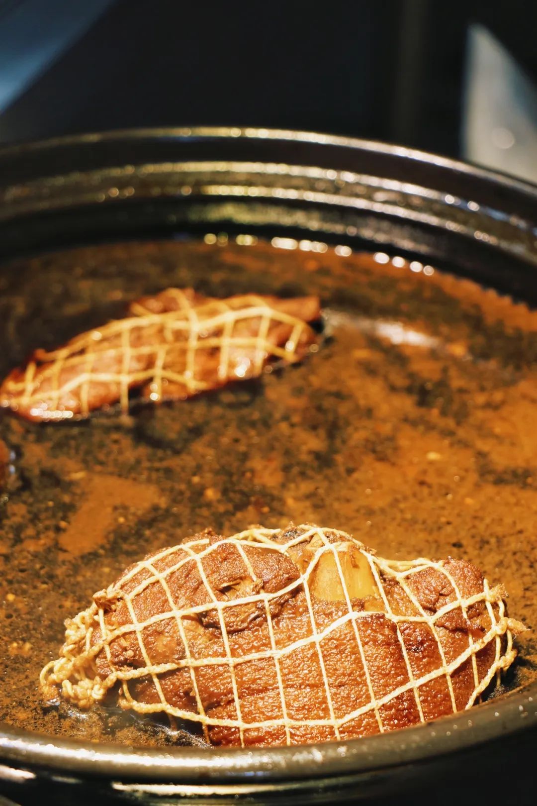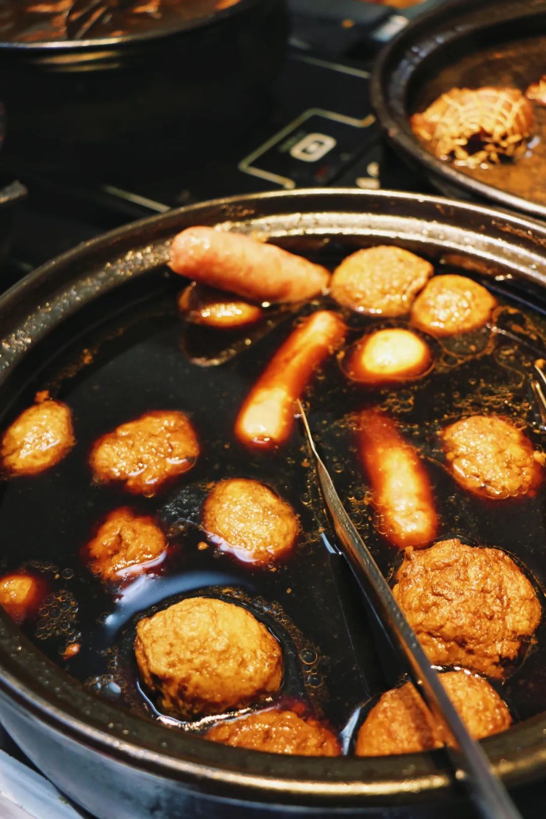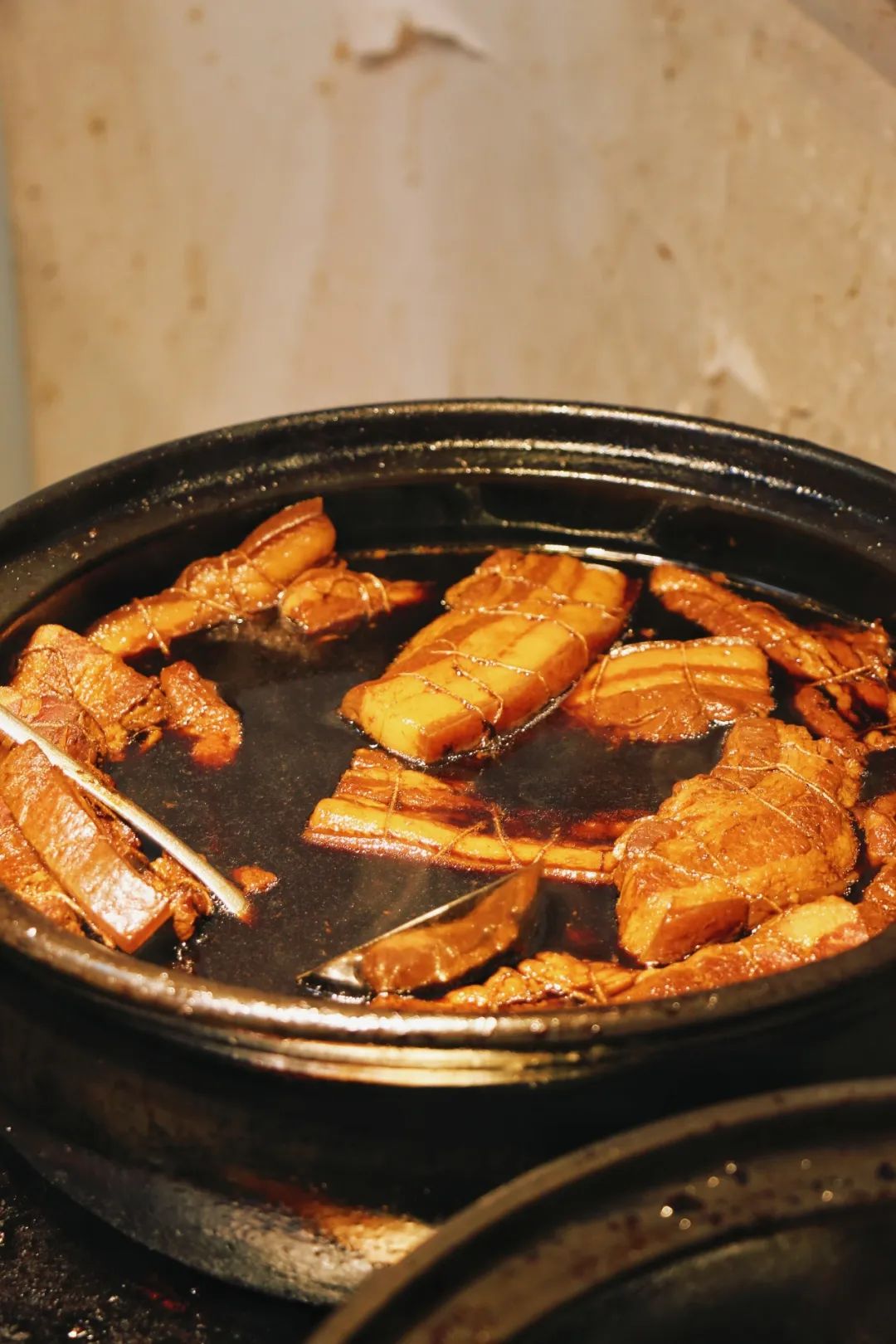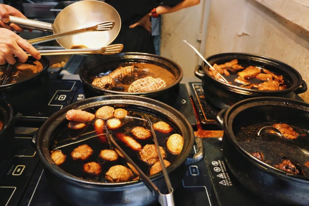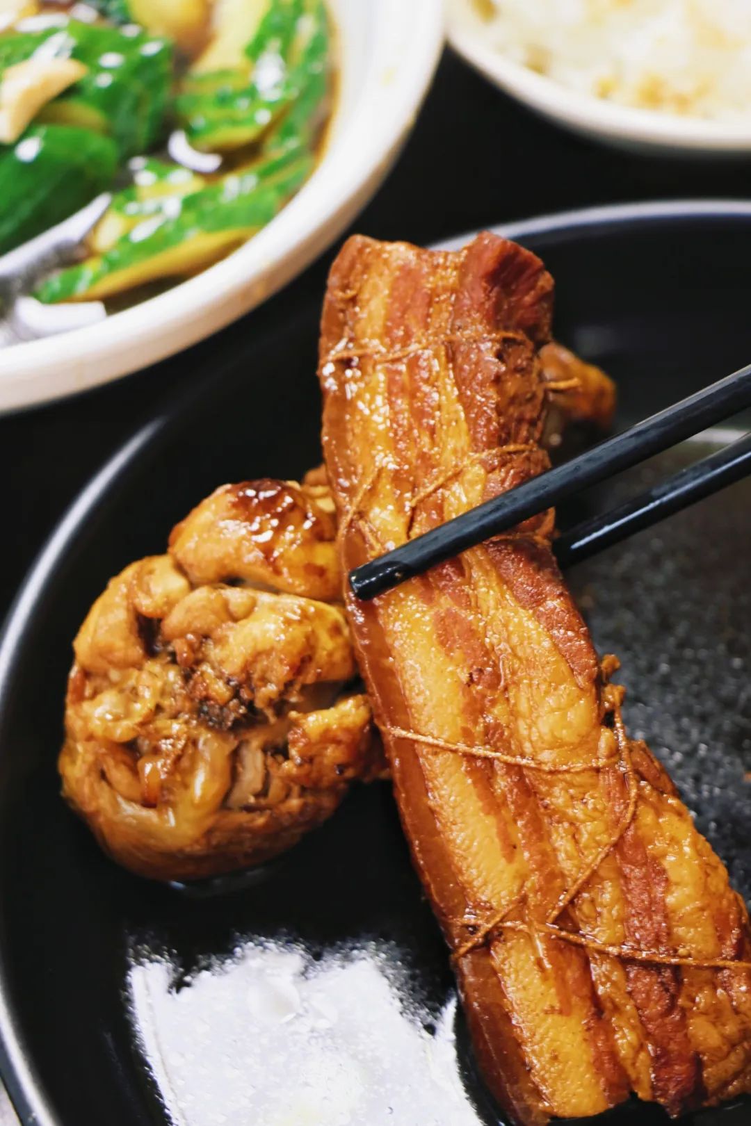 把子肉、东坡肉、鸡腿、狮子头、猪蹄等荤菜各处一锅,根据喜好选择种类、肥瘦即可。在锅前点菜,能闻到很明显的酱油香味。我们点了鸡腿和把子肉。被酱油炖煮后的肉,很是特别。第一次吃把子肉的@书说:半个手掌大小,捆绑的线还留在肉上,色泽红亮,油光闪闪,视觉先得到满足。用筷子切割成小块送进嘴里,肥而不腻,口感有一丢丢类似我最爱的烧白肉,都是肥肉和瘦肉融合绝佳的做法。