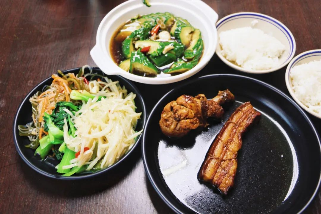 把子肉属于鲁菜,是淮海地区的特色小吃。在成都,专门做把子肉的店并不多。初次前往门店时,才发现这里也和温州饭摊一样,没有菜单,荤素菜摆成一排,选好菜品后,自行端走即可。