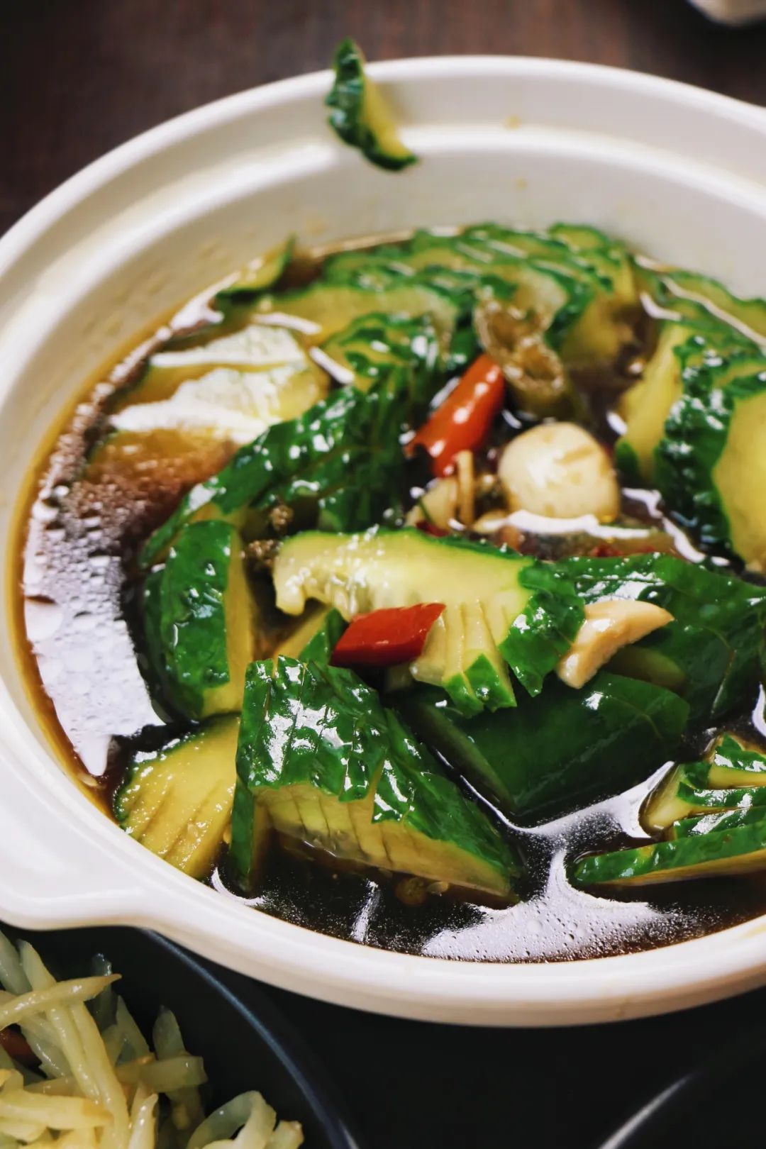 我每次都点的素菜,一定有他家的凉拌黄瓜。一根一盘,刀工了得。能把一整根完整的黄瓜切得连皮不断,比削苹果削出一条龙更有难度。黄瓜的蘸料汁看起来很是“水亮”,吃上一口,醋味明显,酸爽可口。和把子肉、鸡腿搭配,或者就着黄瓜下饭,都很完美。