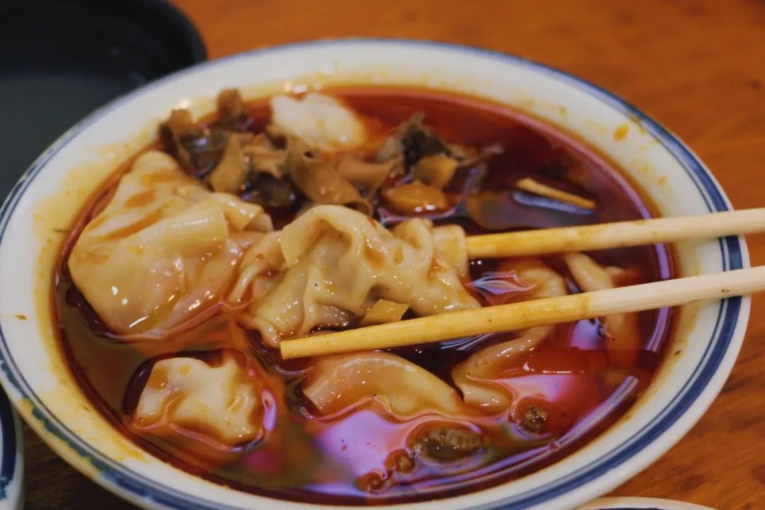 小店里多是附近熟人邻里,经常可以听到声音在两张桌子间跳跃,你来我往,很是亲切。“我天天在这吃抄手的嘛,你们慢慢吃,我先回去了。”隔壁奶奶边说边起身,向邻桌打好招呼,准备离开。同为抄手爱好者,我点了份鸡杂抄手。初看是明晃晃的一碗红油汤头,吃起来却丝毫不油腻。筷子夹起抄手,便能闻到浓郁的鸡汤味,非常鲜美。咬上一口,薄皮儿与细碎的瘦肉馅,更是好搭配。泡椒鸡杂味道也很不错,起到一个锦上添花的作用。