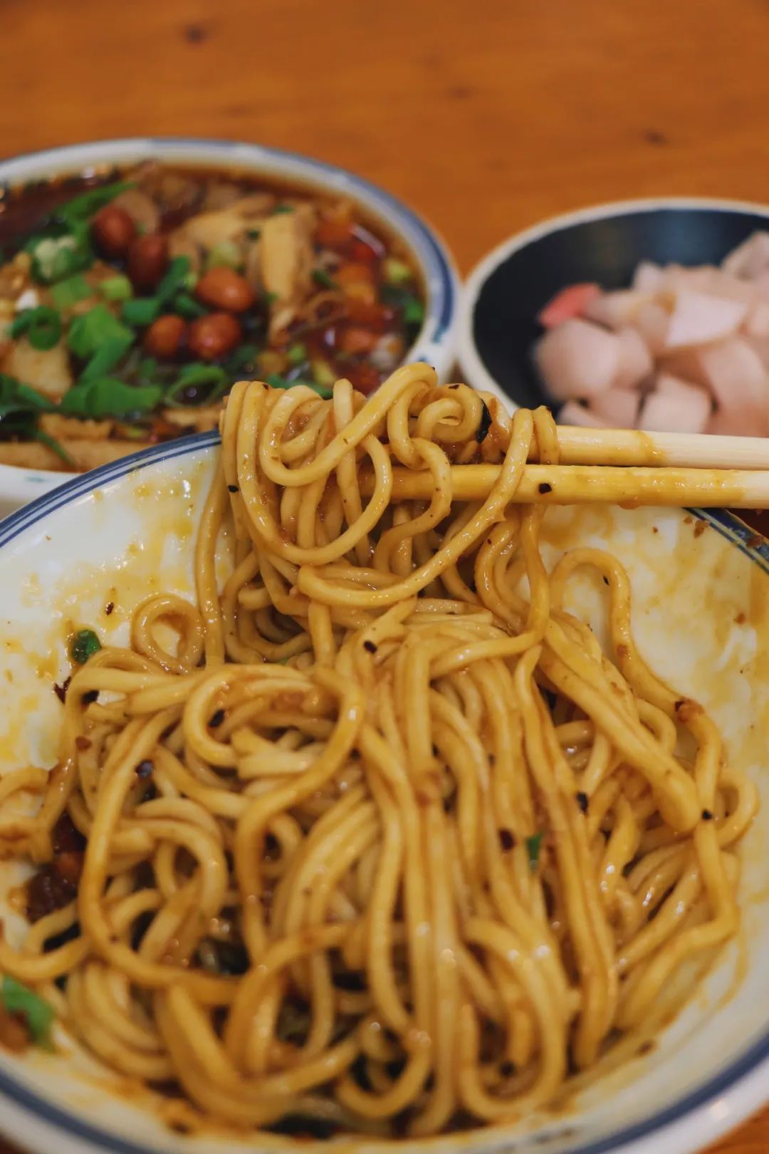 吃面的时候,我们也常会点上一盘鸡片。他家凉拌鸡片的调料,有点像蘸水菜里专门给素菜配的蘸水,一点点椒麻味、不辣不咸。鸡皮Q弹、鸡肉软嫩,在调料里浸泡得刚刚好,吃起来非常清爽。每次吃完离开,还总会发现一个事儿:别人桌上的餐颜值都特别诱人。不同的浇头,成品差别很大,说起来,也算是这家店的特点之一了。(温馨提示,外卖尽量别点面条,时间问题口感会不太好哦)。