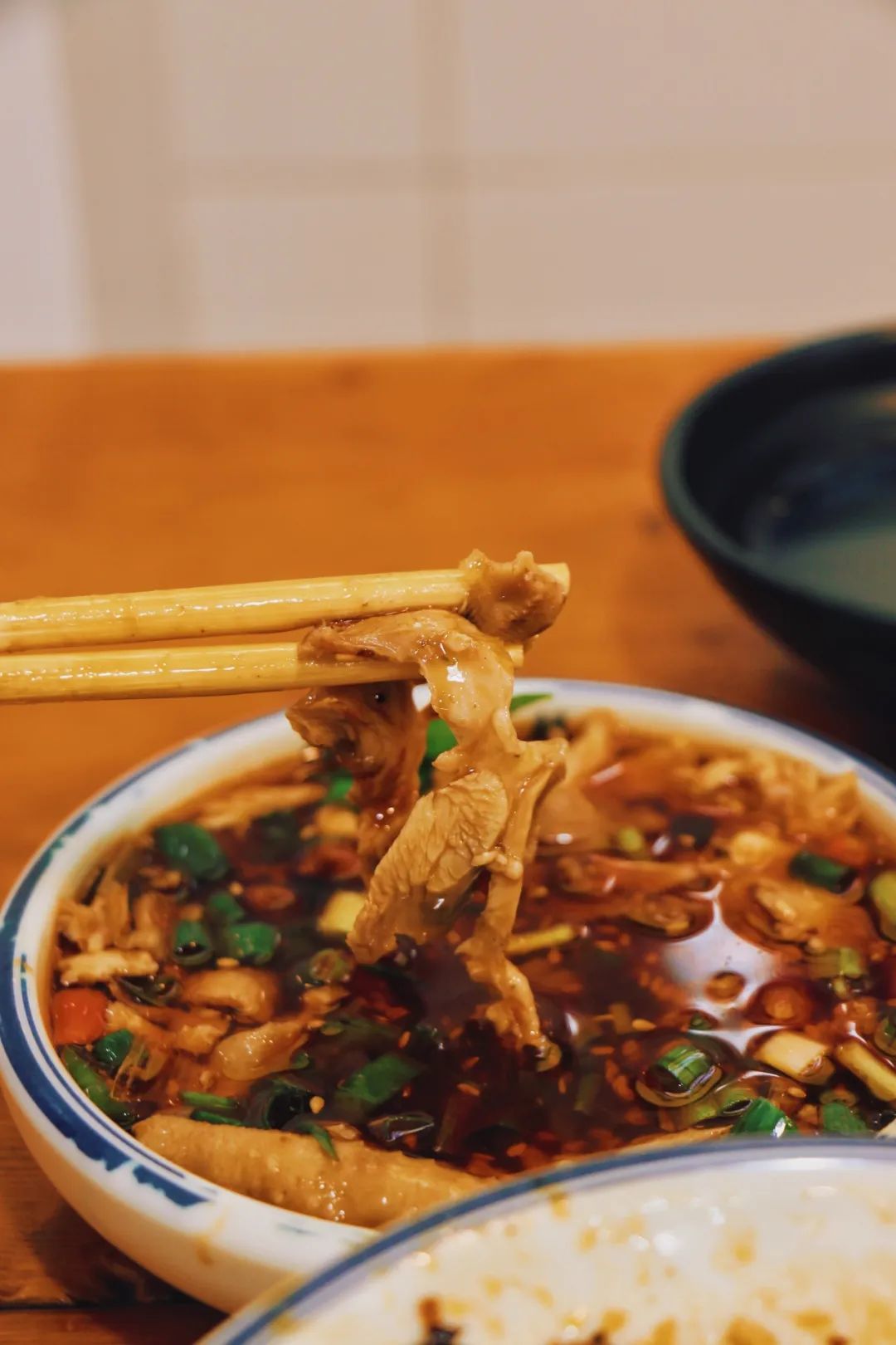 鸡腿肉外表油润,扯下一块,蘸点盘底的酱油,很是鲜嫩,和常吃的卤鸡腿味道差别还是很明显,能感觉到“炖煮”为之更添风味。