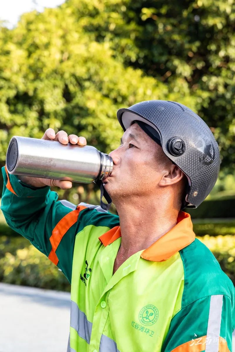 ▲环卫工人万其洪在补充水分。 摄影丨焦亮辉太阳高悬,地面温度接近50℃。在南昌市红谷滩区崛起广场的街角,环卫工人们身着工作服,手持扫帚和簸箕,穿梭在炙热的马路上。在烈日下,他们的身影显得格外醒目,汗水不断从脸颊滑落,浸湿了衣衫,但他们手中的工作却从未停歇。