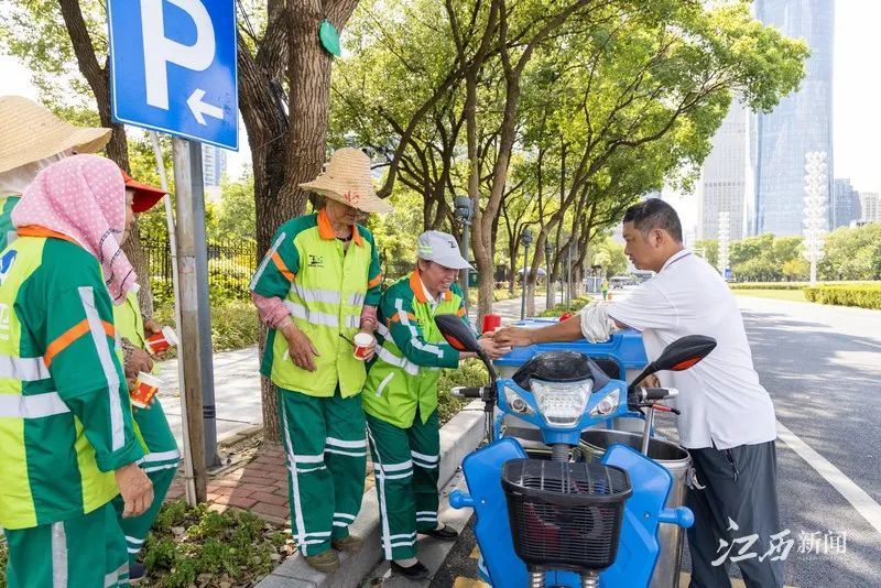 ▲环卫公司给环卫工人送绿豆汤。 摄影丨焦亮辉“我们每天会为环卫工人提供绿豆汤、银耳汤来降温解暑,同时还会发放清凉油、藿香正气口服液等防暑降温物资来保障环卫工人身体健康。”玉禾田沙井、卫东片区环卫经理张良说。单位还灵活调整了作业时间,在最闷热的中午时段将上班时间延后1小时,以减少高温时段的工作强度。