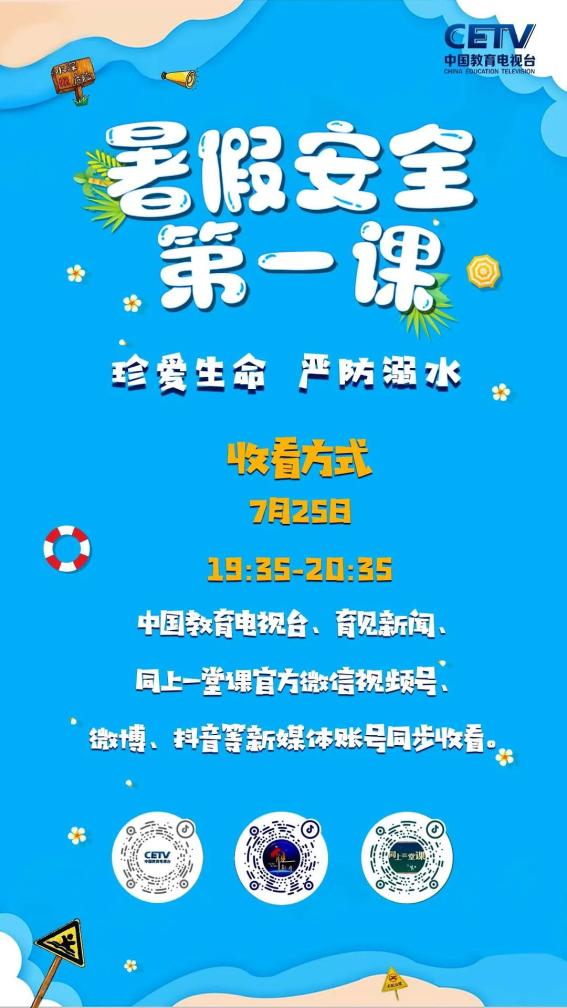 中国教育电视台开展“暑假安全第一课——珍爱生命严防溺水”公益课程活动,倡议各地各校动员各中小学教职员工、学生及家长届时收看。