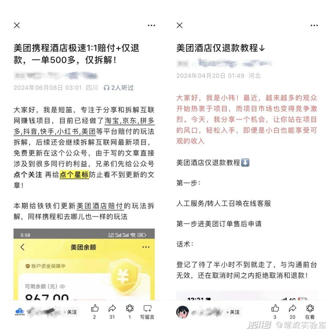 如果说美团外卖上的“仅退款”,还仅仅只是一小部分低素质用户的个人行为,那么借助美团平台预订酒店的产品漏洞,申请大额赔款,则已经演变成为一条薅羊毛与付费教学的灰色产业链。