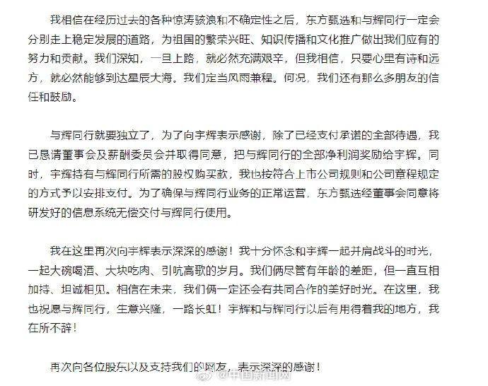 俞敏洪回应董宇辉离职同日,俞敏洪发布《致东方甄选股东朋友的一封公开信》回应:从今天开始,东方甄选的全资子公司与辉同行,将正式从东方甄选独立出去,由董宇辉个人持有其100%股权。为了向宇辉表示感谢,除了已经支付承诺的全部待遇,我已恳请董事会及薪酬委员会并取得同意,把与辉同行的全部净利润奖励给宇辉。