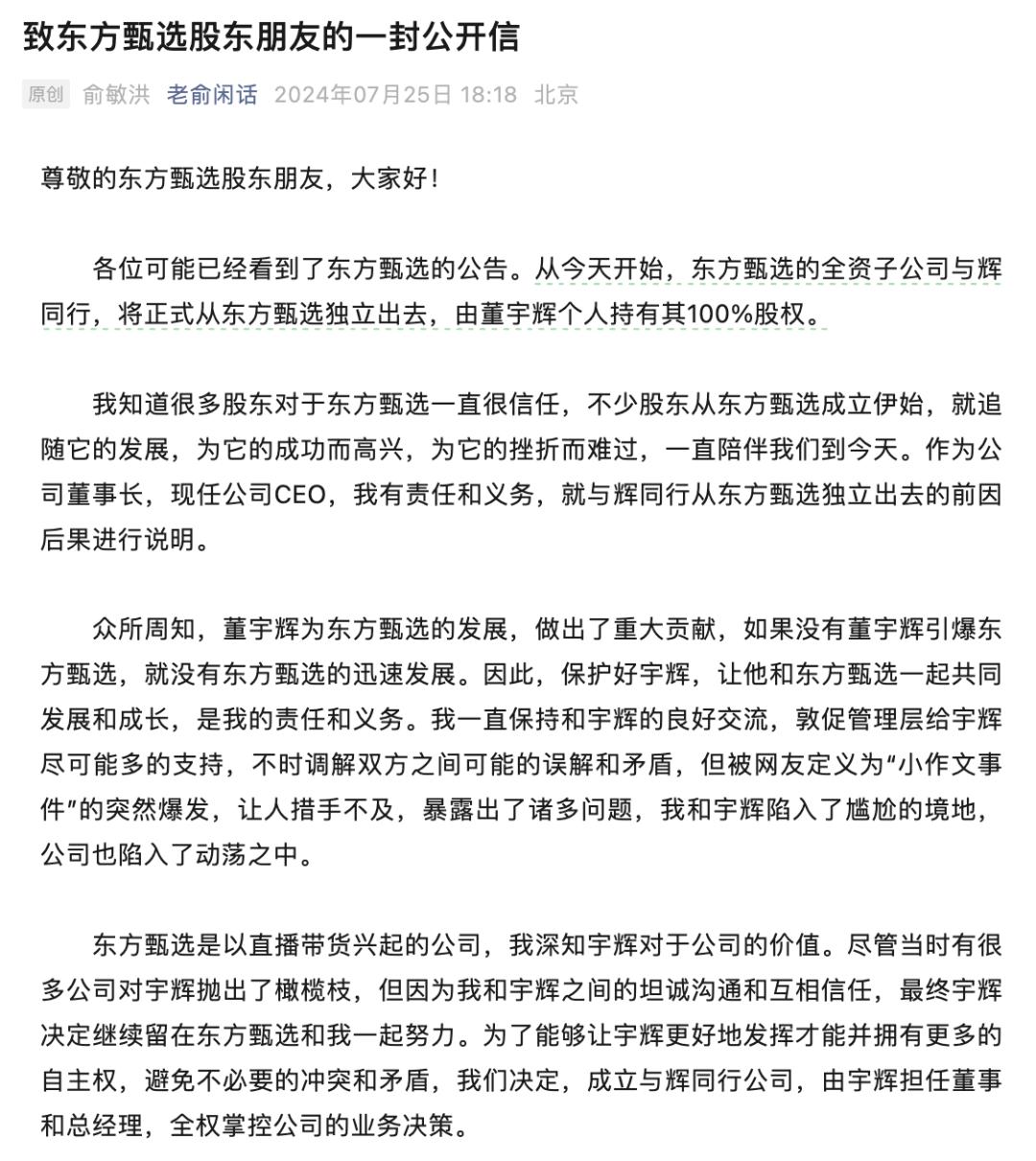 董宇辉离职,本人长文回应,俞敏洪发公开信