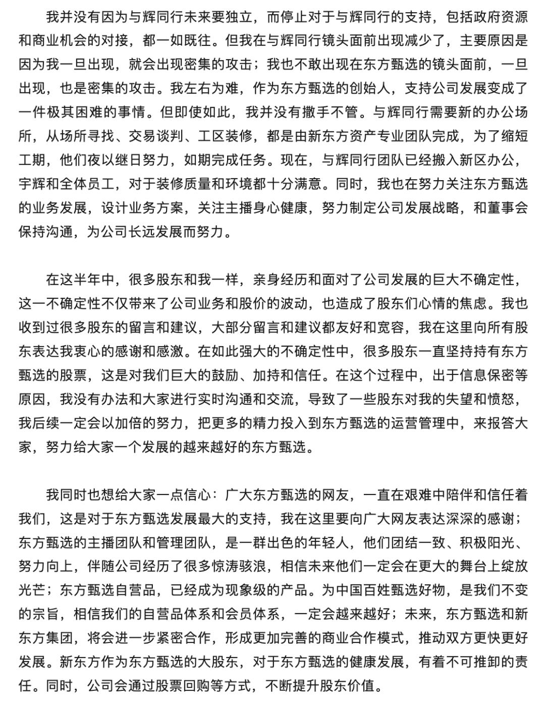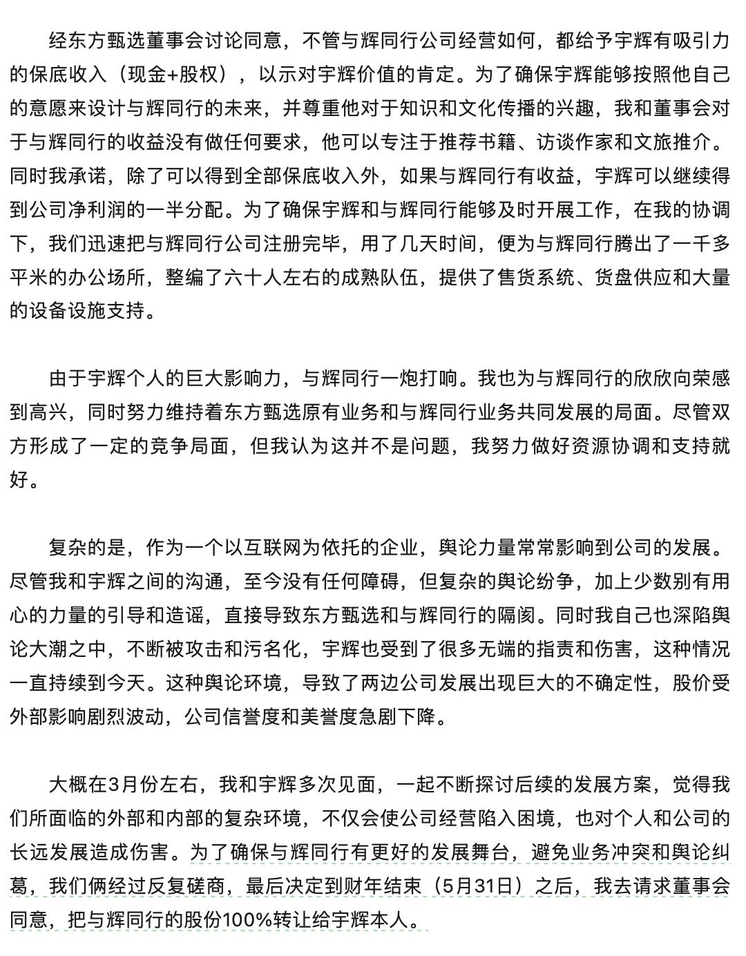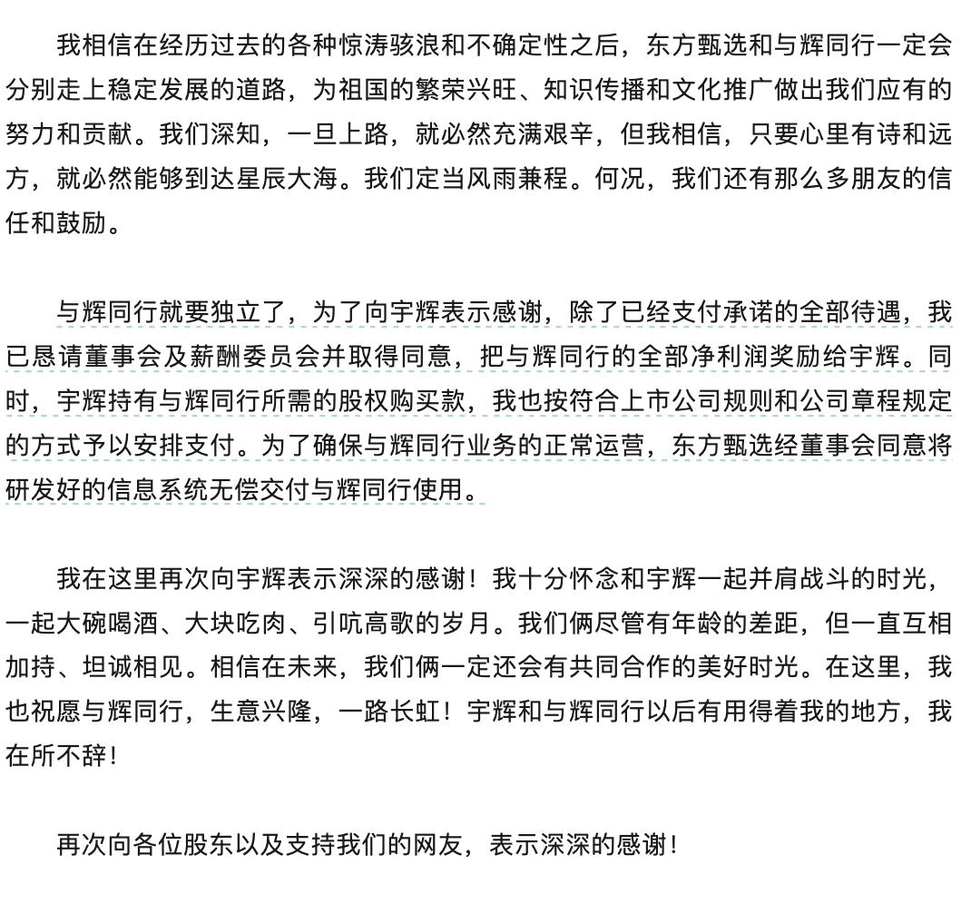 俞敏洪发布《致东方甄选股东朋友的一封公开信》回应:为了向宇辉表示感谢,除了已经支付承诺的全部待遇,我已恳请董事会及薪酬委员会并取得同意,把与辉同行的全部净利润奖励给宇辉。