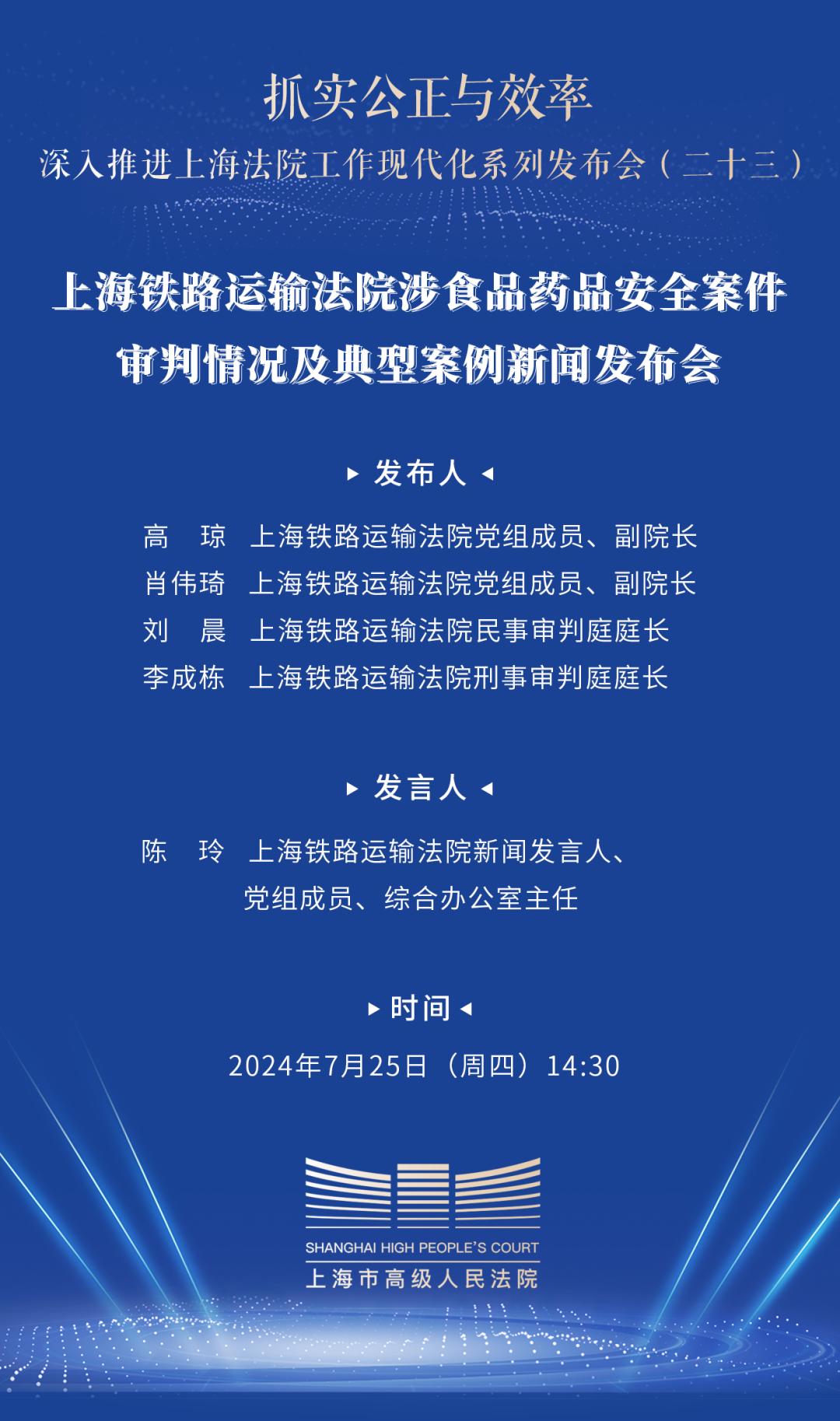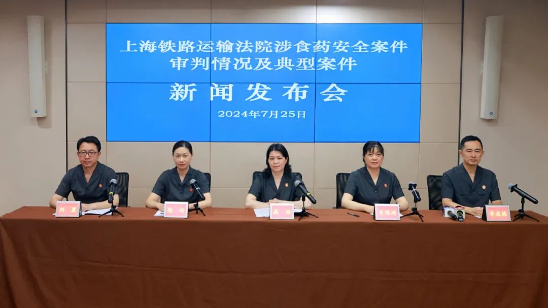今天(7月25日)下午,上海铁路运输法院召开涉食品药品安全案件审判情况及典型案例新闻发布会,通报2021年至2024年上半年该院涉食品药品安全案件审判情况,并发布典型案例。