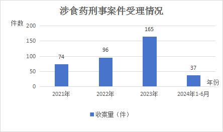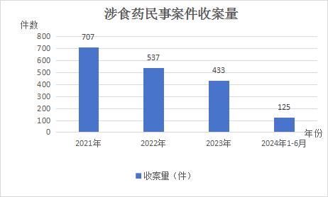 白皮书显示,2021年至2024年上半年,该院共受理涉食品药品刑事案件372件,收案数总体呈增长态势。其中,涉食品类案件为310件,占比83%左右;涉药品类案件为62件,占比17%左右。共涉及罪名5个,主要集中于生产、销售有毒、有害食品罪、生产、销售伪劣产品罪、妨害药品管理罪等3个罪名,共355件,约占涉食品药品刑事案件总件数的95%。