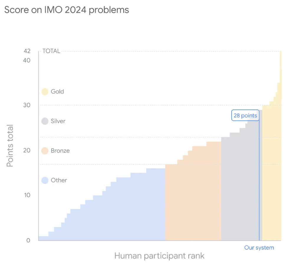 六个问题中的每一个问题满分 7 分,总分最高 42 分。DeepMind 的系统最终得分为 28 分,意味着解决的 4 个问题都获得了满分——相当于银牌类别的最高分。今年的金牌门槛为 29 分,正式比赛的 609 名选手中有 58 人获得了金牌。
