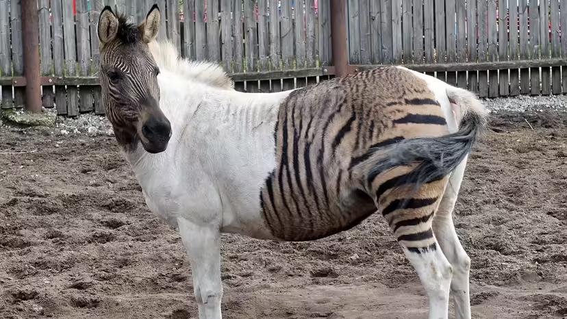 花斑马和斑马后代艾克莉丝的父母分别是一头雄性斑马和一头雌性马,结果它完美继承了双方的优点,只在头部和屁股上有条纹,感觉像是身体被涂了白油漆。