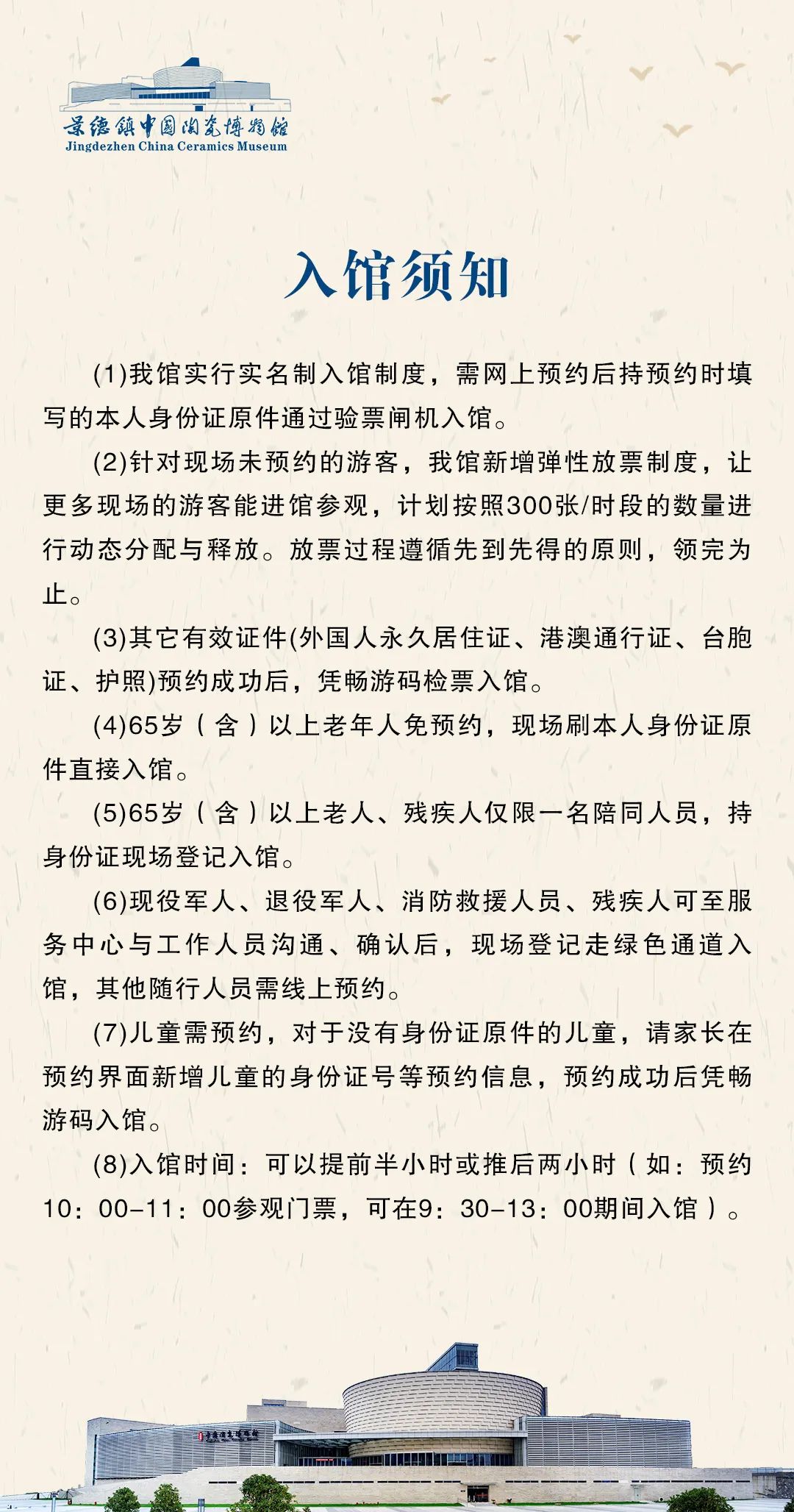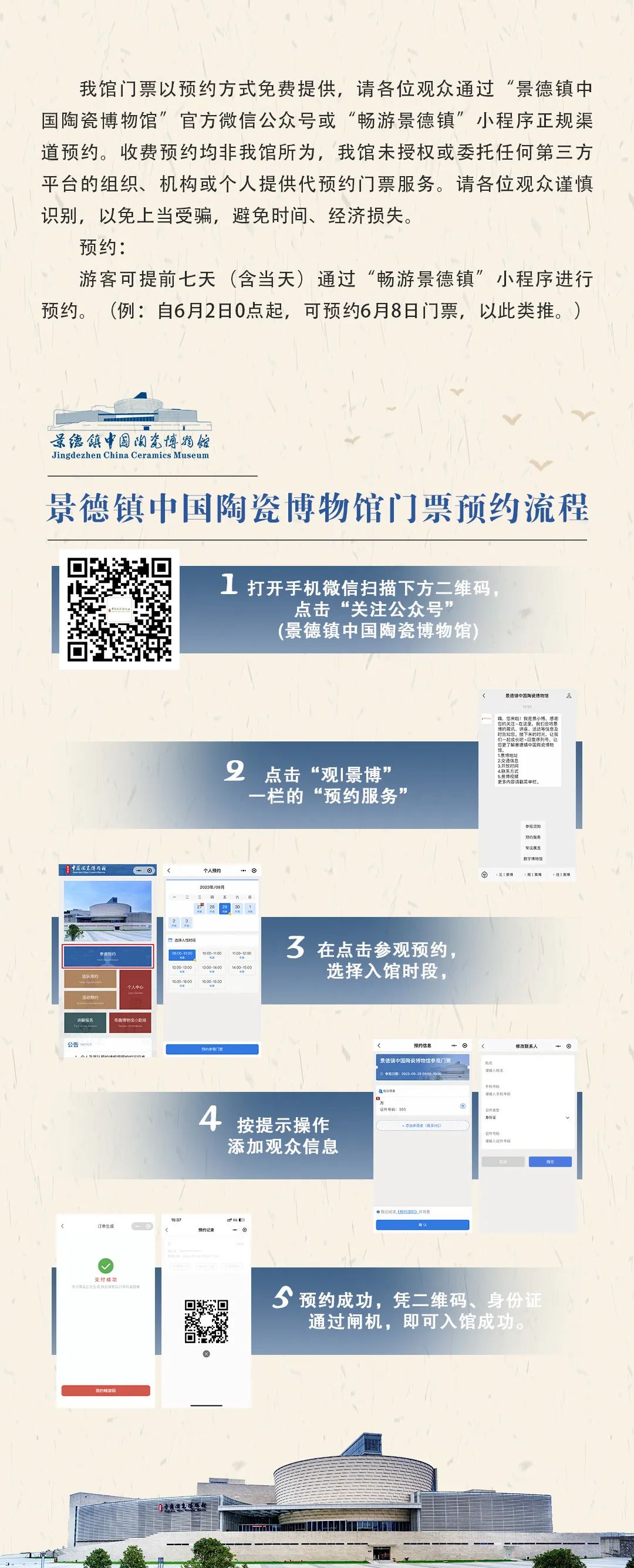 本馆实行分时段预约参观机制,观众可提前7日(含当日)通过“景德镇中国陶瓷博物馆”微信公众号“观景博-预约服务”栏点击进入“畅游景德镇”小程序预约。