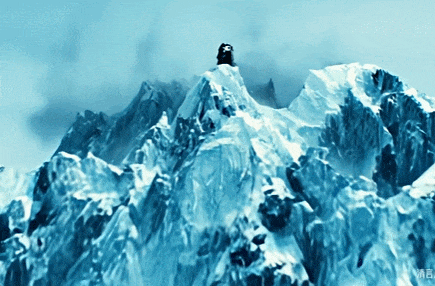 提示词:低角度向上推进,缓缓抬头,冰山上突然出现一条恶龙,然后恶龙发现你,冲向你。好莱坞电影风。