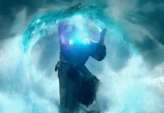 提示词:一个法师正在海浪中施展法术,宝石将海水都聚集过来,打开了一道魔法传送门。