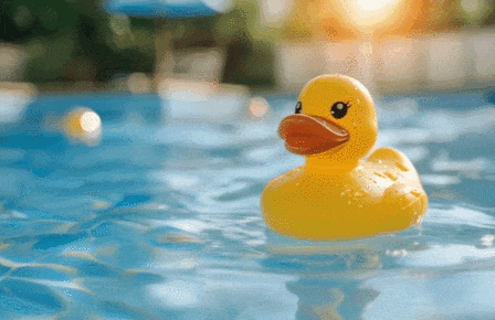 提示词:小黄鸭玩具漂浮在游泳池的水面,特写。