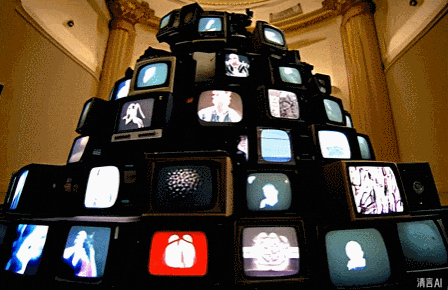 再到现代艺术:提示词:摄像机围绕着一大堆老式电视旋转,这些电视播放着不同的节目 ——20 世纪 50 年代的科幻电影、恐怖电影、新闻、静态、70 年代的情景喜剧等,背景设在纽约博物馆的一个大型画廊里。