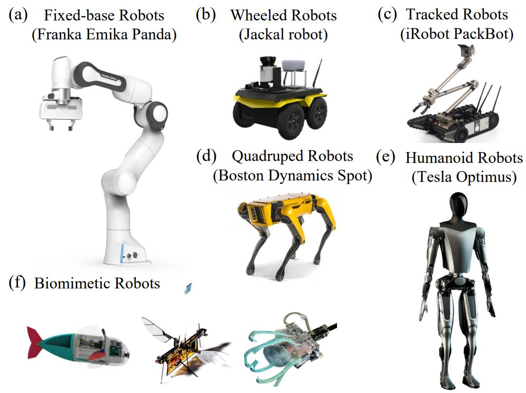 具身智能体积极与物理环境互动,涵盖了广泛的具身形态,包括机器人、智能家电、智能眼镜和自动驾驶车辆等。其中,机器人作为最突出的具身形态之一,备受关注。根据不同的应用场景,机器人被设计成各种形式,以充分利用其硬件特性来完成特定任务。如下图所示,具身机器人一般可分为:(1)固定基座型机器人,如机械臂,常应用在实验室自动化合成、教育、工业等领域中;(2)轮式机器人,因高效的机动性而闻名,广泛应用于物流、仓储和安全检查;(3)履带机器人,具有强大的越野能力和机动性,在农业、建筑和灾难场景的应对方面显示出潜力;(4)四足机器人,以其稳定性和适应性而闻名,非常适合复杂地形的探测、救援任务和军事应用。(5)人形机器人,以其灵巧手为关键,在服务业、医疗保健和协作环境等领域广泛应用。(6)仿生机器人,通过模拟自然生物的有效运动和功能,在复杂和动态的环境中执行任务。