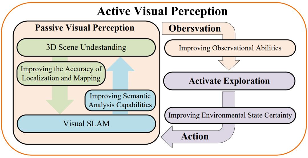未来视觉感知的 “北极星” 是以具身为中心的视觉推理和社会智能。如下图所示,不同于仅仅识别图像中的物体,具有具身感知能力的智能体必须在物理世界中移动并与环境互动,这需要对三维空间和动态环境有更透彻的理解。具身感知需要具备视觉感知和推理能力,理解场景中的三维关系,并基于视觉信息预测和执行复杂任务。该综述从主动视觉感知、3D 视觉定位、视觉语言导航、非视觉感知(触觉传感器)等方面进行介绍。
