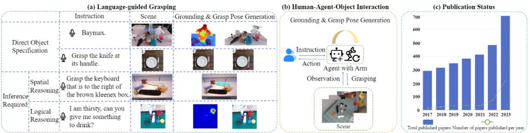 具身问答框架除了与人类进行问答交互外,具身交互还涉及基于人类指令执行操作,例如抓取和放置物体,从而完成智能体、人类和物体之间的交互。如图所示,具身抓取需要全面的语义理解、场景感知、决策和稳健的控制规划。具身抓取方法将传统的机器人运动学抓取与大型模型(如大语言模型和视觉语言基础模型)相结合,使智能体能够在多感官感知下执行抓取任务,包括视觉主动感知、语言理解和推理。