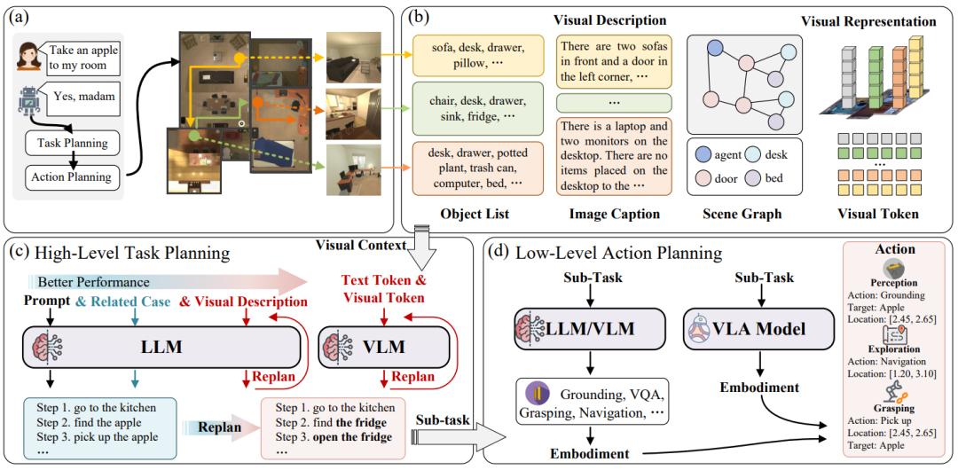 (2)通过有效利用具身感知和具身交互模型,或利用基础模型的策略功能,逐步实施这些子任务,这被称为低层次的具身行动规划。