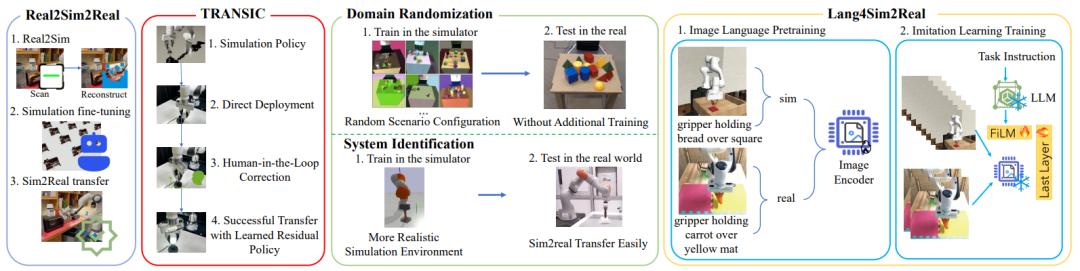 具身智能中的虚拟到现实的迁移(Sim-to-Real adaptation)指的是将模拟环境(数字空间)中学习到的能力或行为转移到现实世界(物理世界)中的过程。该过程包括验证和改进在仿真中开发的算法、模型和控制策略的有效性,以确保它们在物理环境中表现得稳定可靠。为了实现仿真到现实的适应,具身世界模型、数据收集与训练方法以及具身控制算法是三个关键要素,下图展示了五种不同的 Sim-to-Real 范式。