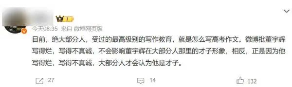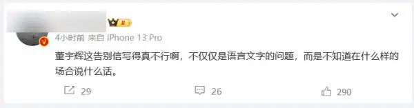 有网友表示,董宇辉的告别信写得不好、不真诚,“不仅仅是语言文字的问题,而是不知道在什么样的场合说什么话。”