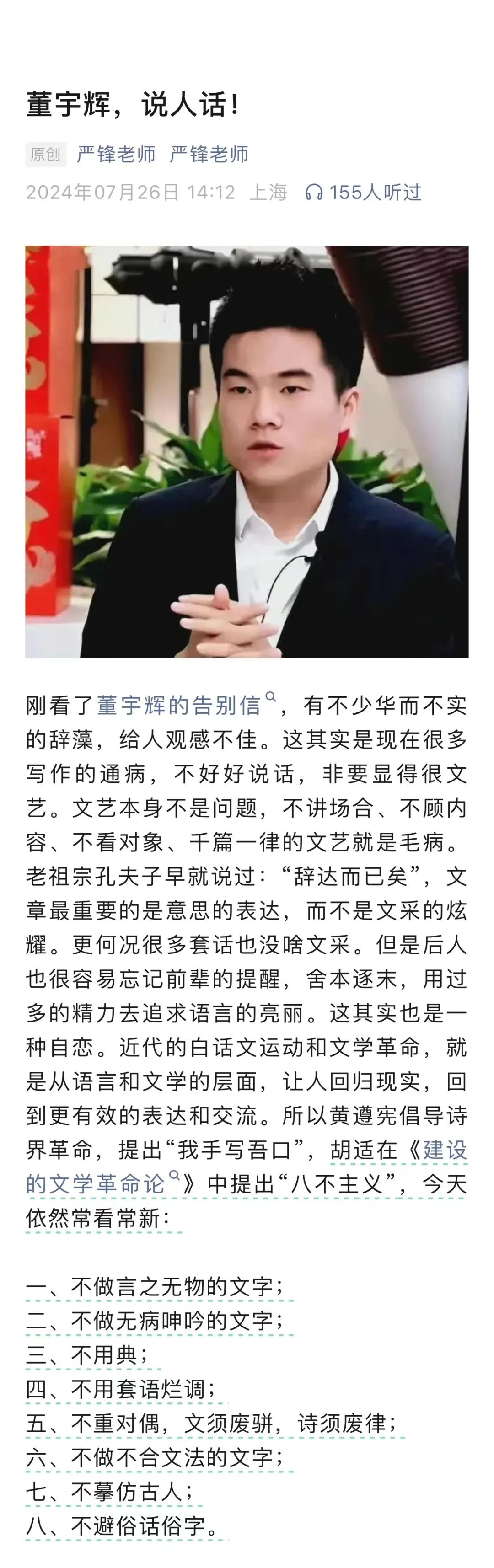 对此,26日复旦大学中文系教授严锋在个人公众号上发表题为《董宇辉,说人话!》的文章,批评董宇辉的告别信“有不少华而不实的辞藻,给人观感不佳”。