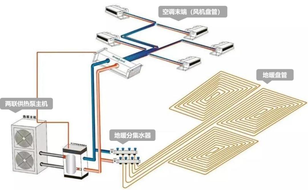 空调地暖两联供系统新风系统的能源利用效率参数用单位风量耗功率来表示,功率越低越节能。普通新风系统具有单向送、排风功能,还有一种带热回收装置的新风系统,除了送风以外,还可以收集回风中的冷热量再利用,可以显著减少能量损耗,节约能源。一般来说,带有全热回收装置的新风系统能回收的热量更多,制冷/制热焓效率最高可达70%以上。