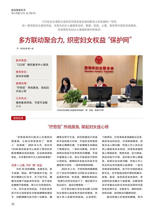 深圳市妇联作为其中的优秀代表,一方面充分利用12338妇女维权公益服务热线创新妇女维权方式方法,构建组合型维权关爱团队,创建深圳市妇女儿童维权关爱智慧系统,统筹市、区、街道、社区四级妇联力量,同时充分利用妇联“联”的作用,加强与相关部门和社会组织的合作,共同推动妇女群众权益保障工作,成效显著。