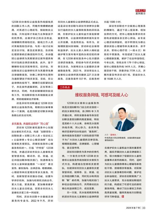 同时,深圳市妇联十分重视法律服务的专业化。2022年9月,深圳市妇女儿童维权公益律师团正式成立,这是深圳市妇联与深圳市律师协会联合打造的妇女儿童维权服务的深圳品牌,在维护妇女儿童权益方面发挥着重要作用。
