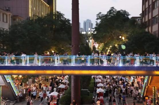 “1956烟火集市”虽短,但辐射能力巨大。向东穿过华润万家天桥,直通着金鱼公园;向西经过新建的新时代广场,连接着街心公园。一路上,新建的多彩景观和丰富的文化活动让人应接不暇,网红楼梯、景观小品、惠民音乐会、热闹广场舞……激活了老城区丰富的文化内涵,延展出新时代城市的青春活力。