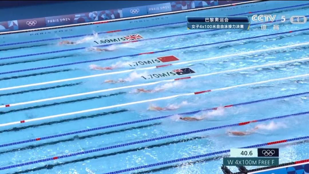 中国女子4x100接力棒次依次为:杨浚瑄、程玉洁、张雨霏、吴卿风,中国选手在第三泳道