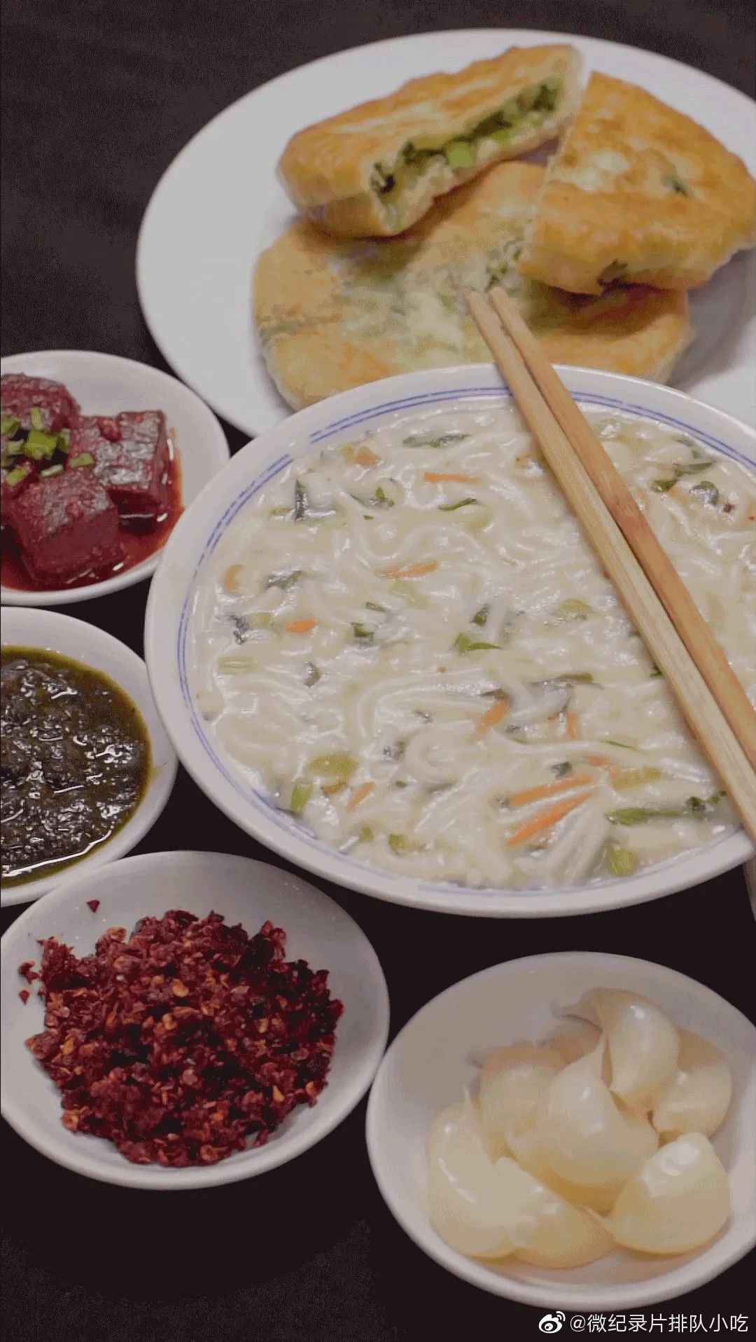 △图源:@微纪录片排队小吃洛阳街头巷尾随处可见的浆面条,是由绿豆浆发酵制成的。直观外表下的浆面条,一览无余的是胡萝卜和青菜的红绿搭配,再分别加入些黄豆、花生、芹菜末,经过韭花、辣椒、醋的加持,这份黏稠软糯,就是家的味道。