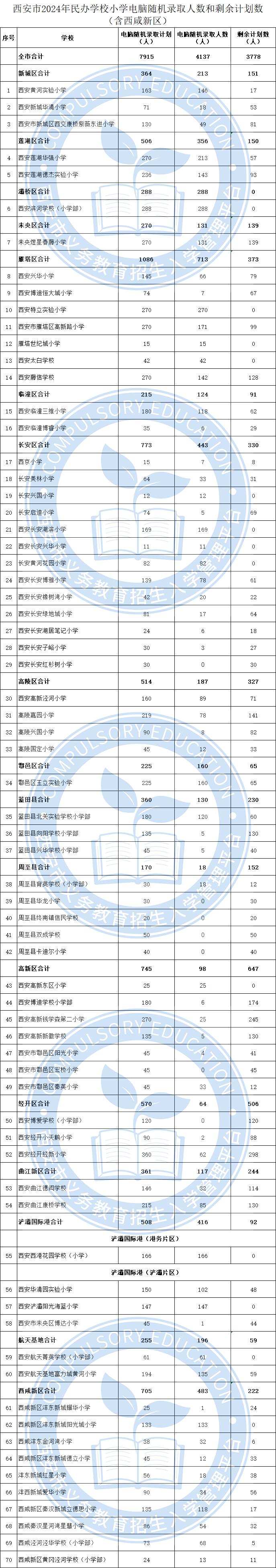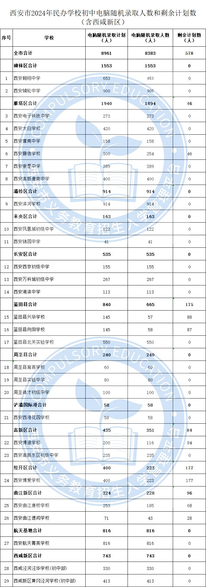 西安市2024年民办义务教育学校电脑随机录取工作顺利结束 部分学校将补录→截至7月28日上午11:20,西安市2024年民办义务教育学校电脑随机录取工作顺利结束。民办义务教育学校剩余计划4356人,其中7所民办初中剩余计划578人,57所民办小学剩余计划3778人。7月29日,相关区县、开发区公布民办学校补录计划。7月30日上午8时至31日下午14时,进行补录报名。7月31日下午14时,报名结束后,各相关区县、开发区组织电脑随机录取补录工作。(记者 王燕 实习生 薛文静)
