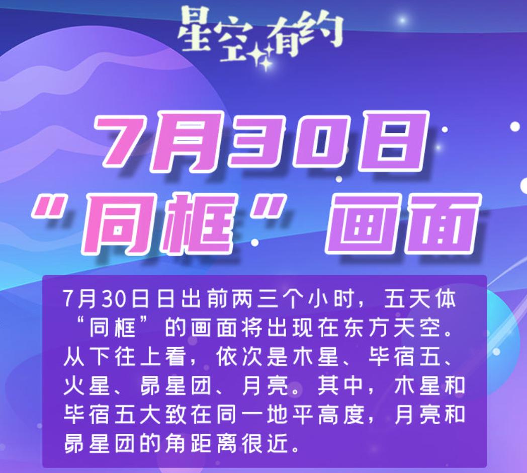 7月30日至31日,我国黎明前的夜空会出现火星、木星、毕宿五、昴星团和月亮“同框”的画面,感兴趣的公众可以一观。