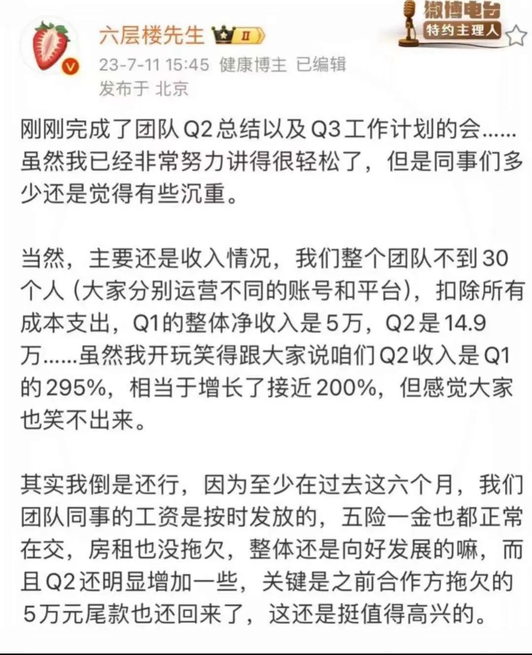自2018年“双十一”接到第一条广告起,做周边、卖书、付费课程、接推广……他积极地寻求可能的盈利方式。对于“商业气息浓厚”的指责,他反而乐见其成,这意味着他的团队能接到更多的商单,更可能存活下去。2023年7月,六层楼在微博公开了团队前两季度净利润,加起来约20万,“虽然说挣不了大钱,但是活下去是没问题的”。