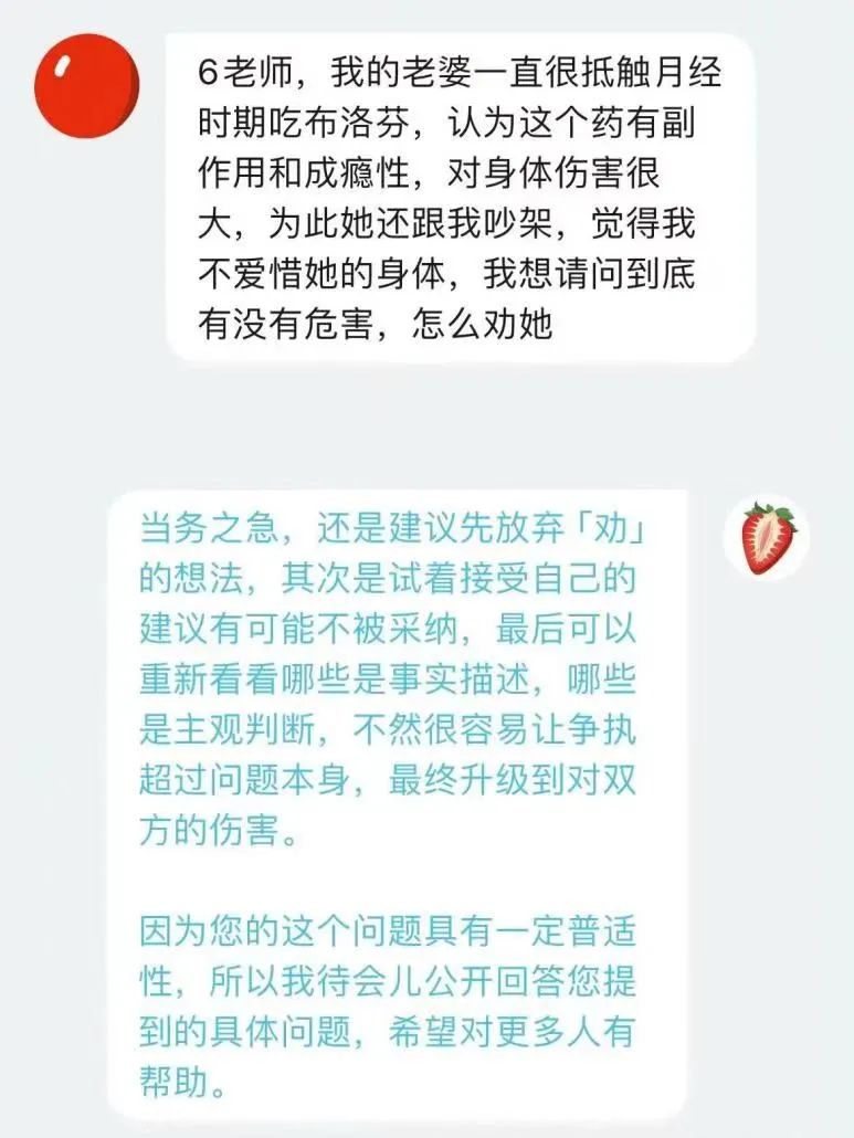 有读者咨询“经期服用布洛芬有没有危害”,六层楼首先阐述了布洛芬的适用症状及副作用,接着介绍了其他缓解痛经的方法,并强调女性应基于真实感受和自我意愿做出选择。对这则私信进行公开回复可能帮助更多女性正确对待止痛药以及选择最适合自己的止痛方式。