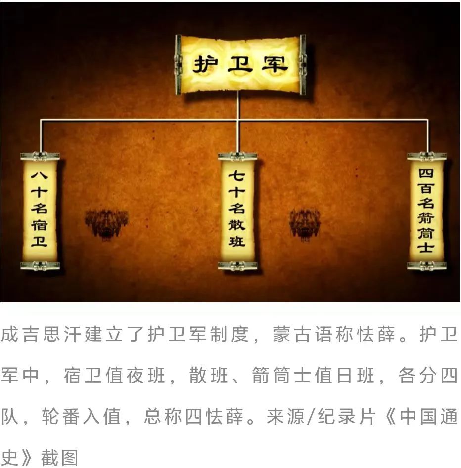 其二,君臣关系变为主奴关系。自古以来,君臣之间在政治权力和社会地位等诸多方面并不平等,但在人格上仍存在某种抽象的平等——“君使臣以礼,臣事君以忠”,君臣之间,以礼遇换忠诚;“邦有道则仕,邦无道则可卷而怀之”,臣子有不合作的权利。这种“抽象的平等”到蒙古人这里宣告终结。成吉思汗建立的怯薛制度,就是以大汗的贴身宿卫充当国家的管理者。怯薛分管大汗的冠服、弓矢、饮食、文史、车马、帐篷陈设、府库、医药、卜祝之事,通过世代为大汗服务,来获得处理政务、治理国家、官至宰相的地位。对蒙古贵族来说,没有什么比作为奴婢服侍大汗或皇帝更光荣的事业了。成吉思汗刚刚崛起时,木华黎的父亲将他送到成吉思汗身边,要他“永远做奴婢者”,“若离了你门户呵,便将脚筋挑了,心肝割了”。木华黎家族在元朝世代身居高位,但他们认为最贵、最足以骄人的是“老奴婢根脚”。