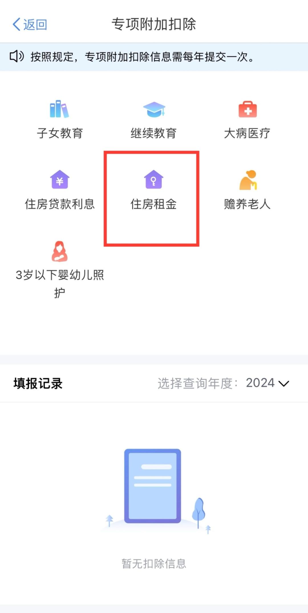 二、个税APP具体操作流程:1.打开个人所得税APP,选择首页的“专项附加扣除填报”,选择“住房租金”。