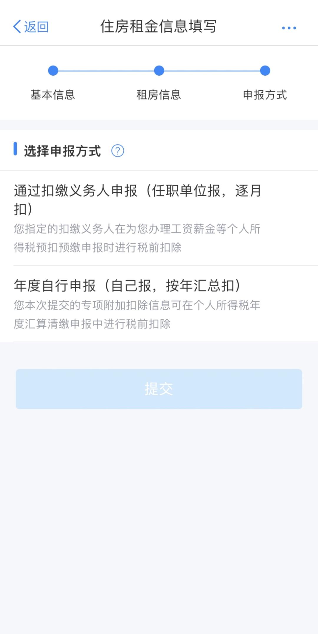 4.选择申报方式,可选择通过扣缴义务人申报也可以选择综合所得年度自行申报。最后点击“提交”即可。