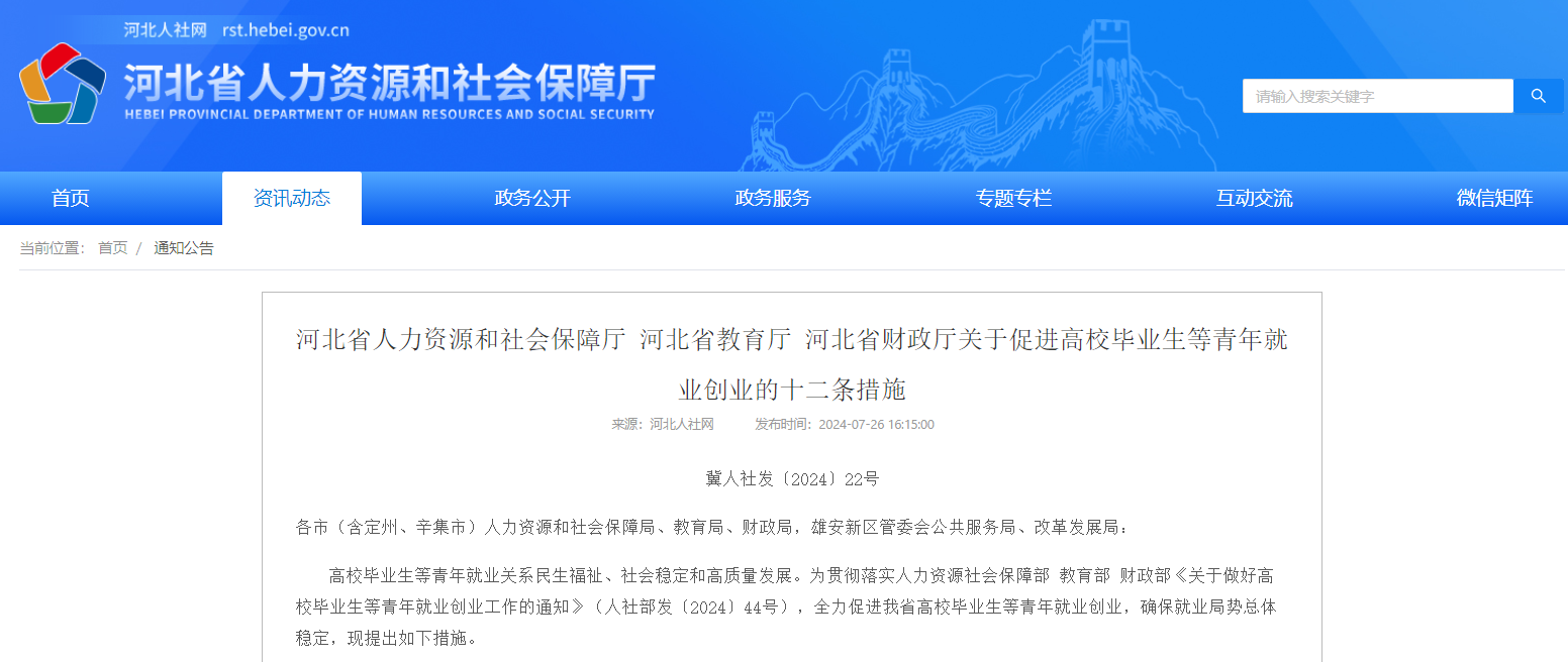 河北省人力资源和社会保障厅 河北省教育厅 河北省财政厅关于促进高校毕业生等青年就业创业的十二条措施冀人社发〔2024〕22号