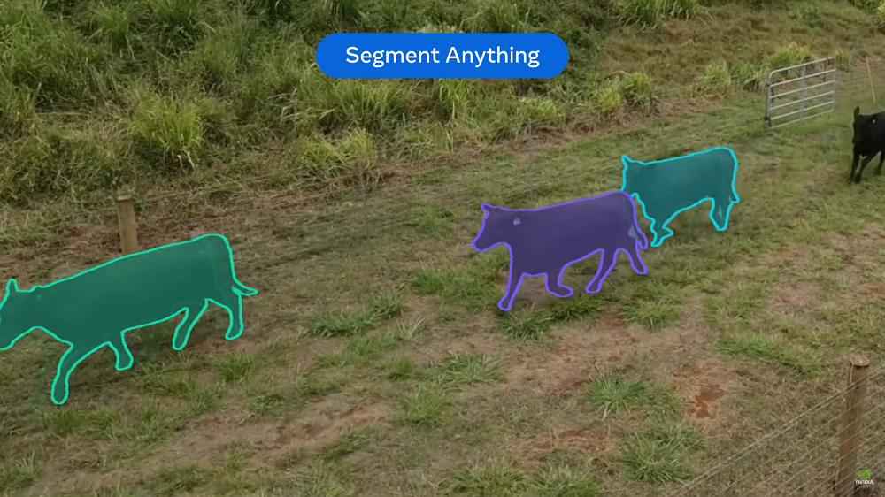 扎克伯格:你刚才谈到的Segment Everything模型,我们即将会在SIGGRAPH上推出2.0版本。它更快,同时也适用于视频。画面中是我牧场里的牛。