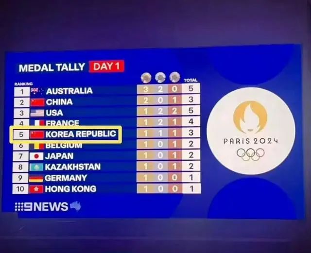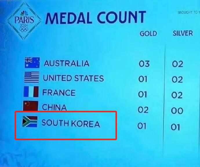 首日金牌榜出炉之后,现场奖牌榜又把韩国国旗标错成了中国国旗。