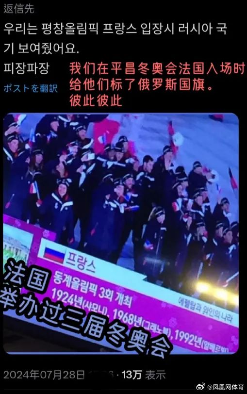 图源:新黄河另据报道称,开幕式当天,奥运会官方社交媒体账号上传了多组各国代表团乘船入场照片。不过,值得注意的是,有韩国网友发现,在这些照片中,唯独韩国国旗被“虚化”且看不到任何韩国运动员的正脸。此事在韩国“引发争议”,有网友称,“韩国遭到了歧视”。