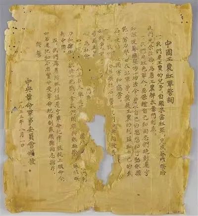 陈列在瑞金中央革命根据地纪念馆的《中国工农红军誓词》。资料图片8月1日,按照中革军委决定,红一方面军隆重举行了“八一”建军日纪念活动。自此,人民军队有了一个统一、固定的纪念日。中华人民共和国成立后,中国工农红军纪念日改称为中国人民解放军建军节。